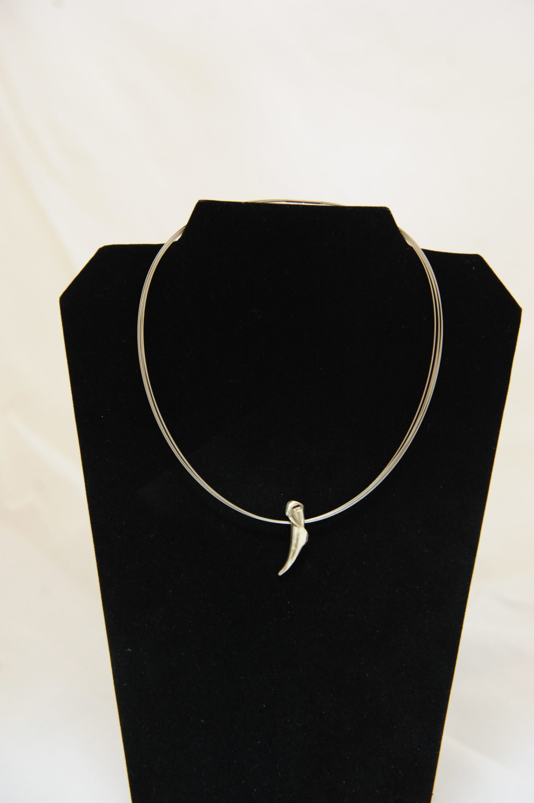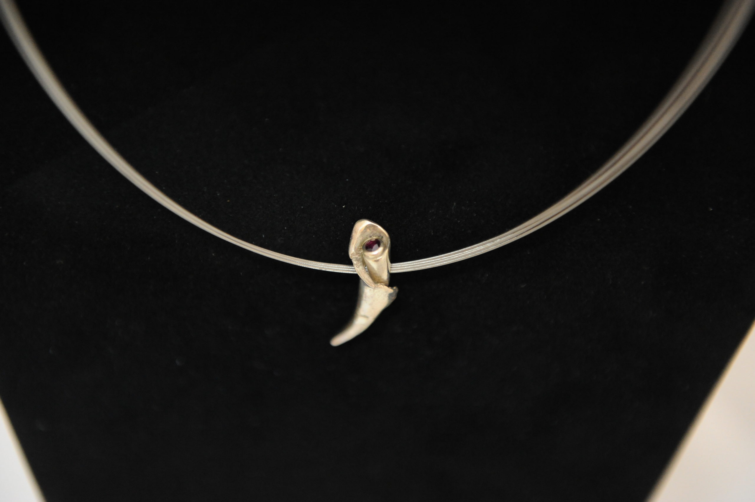 Blütenförmiger Anhänger der fest in seinem Inneren einen Rubin hält,der von mehreren Stahlfäden gehalten wird.