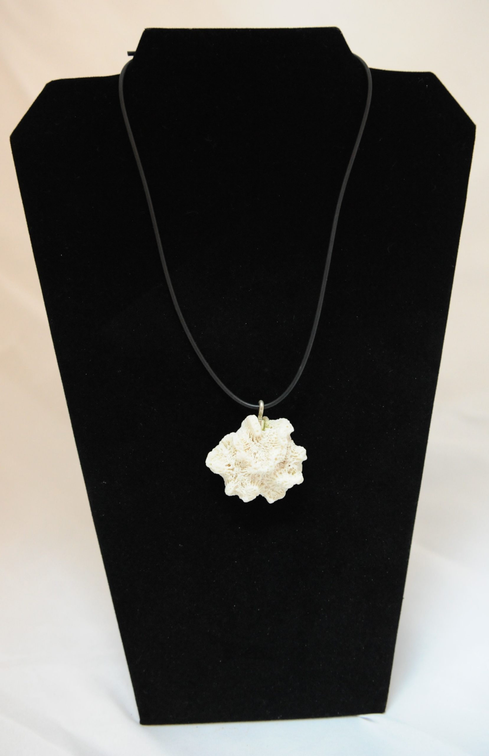 Korallenanhänger der an Silberöse am Lederband hängt. Koralle -Fundstück aus Cozumel-Mexiko.