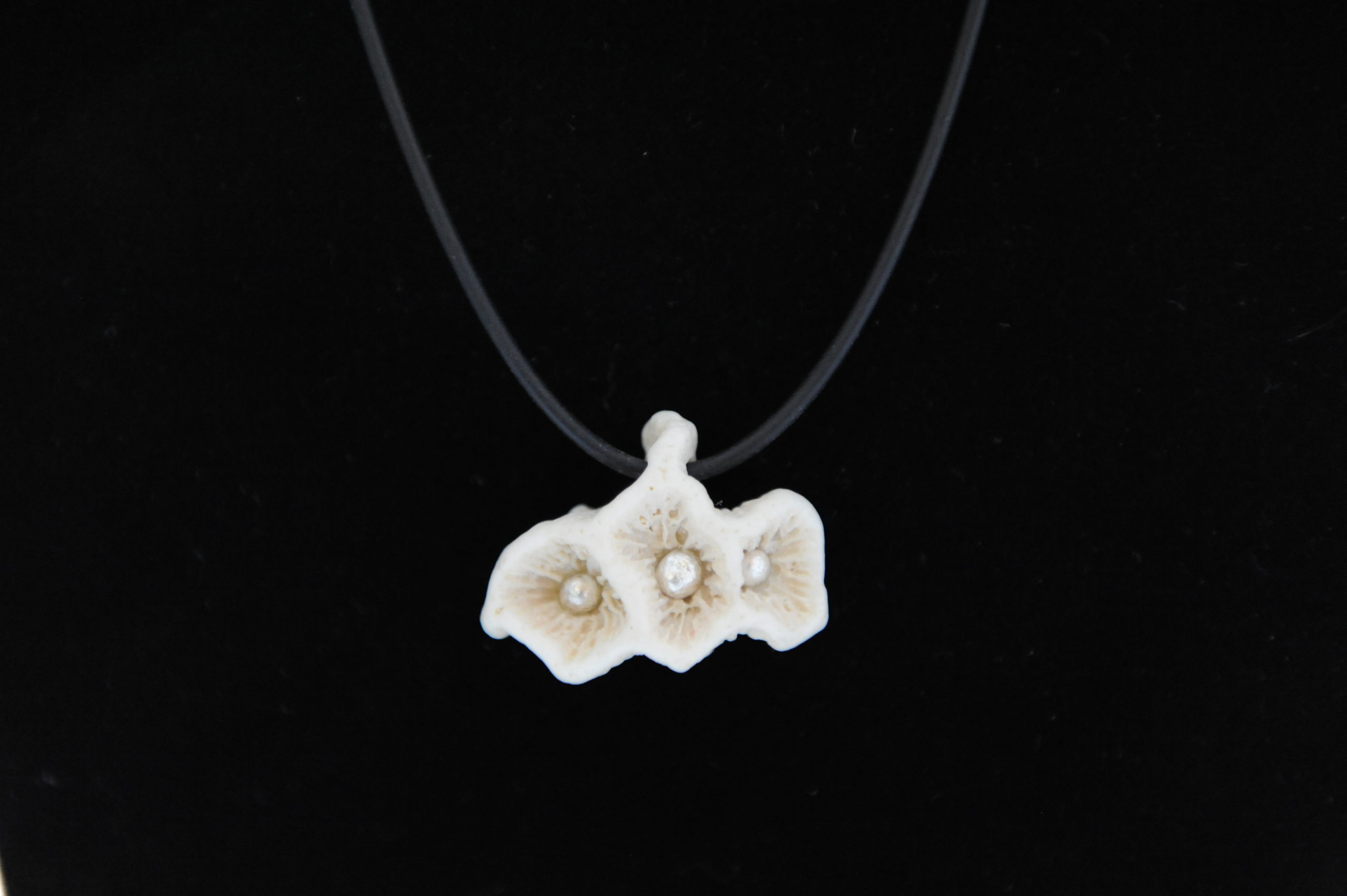 Korallenanhänger der Blüten ähnelt und 3 Silberperlen in sich trägt.