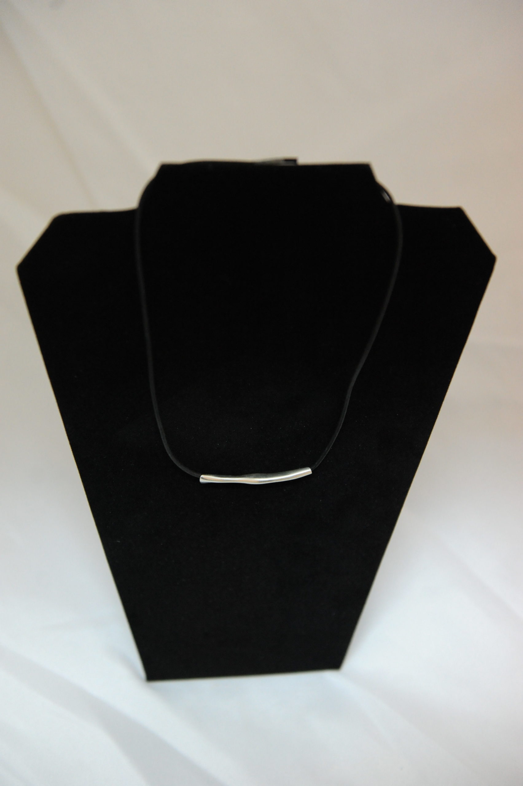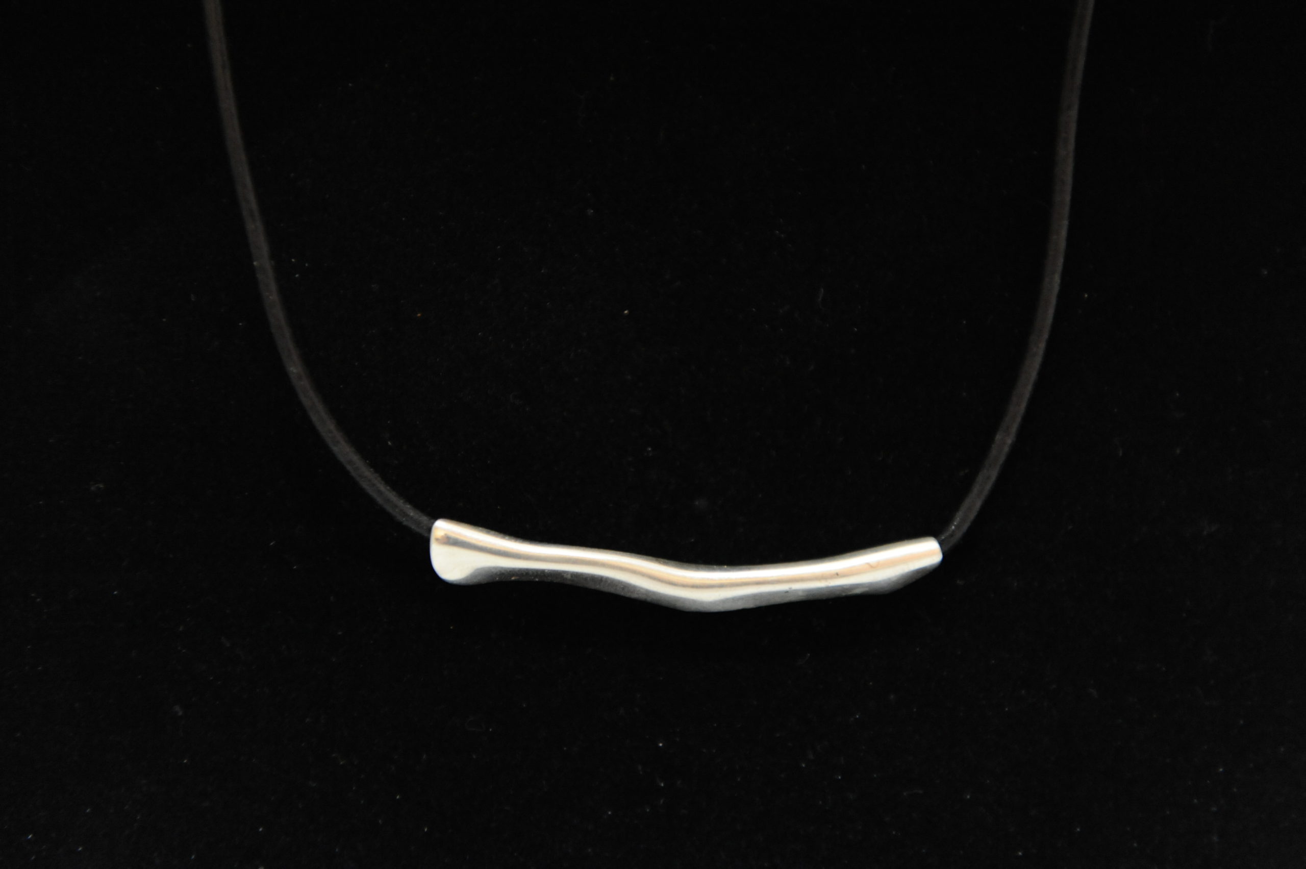Anhänger aus Silber von einem Lederband gehalten.